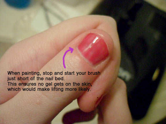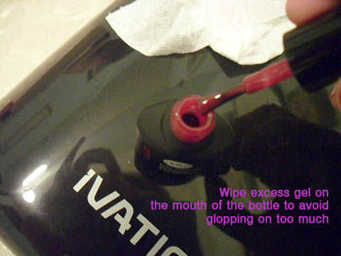 Limpie exceso gel polaco fuera el cepillo en la boca de la botella de. Pulimento del gel es muy viscoso y se sangran en las esquinas de tus uñas si usas globos grandes.