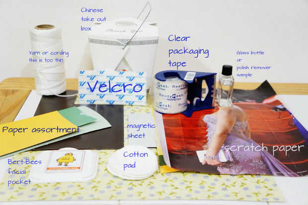 Usted puede embalar la caja con esmalte de uñas, cote clara, botella de removedor de esmalte, cojines de algodón, tablero de esmeril, archivo de clavo, podadoras de clavo de dedo y doblado papel de desecho. Había reforzado los agujeros con cinta adhesiva pero realmente no creo que usted necesita para que no agrego a la lista. Puede utilizar cinta adhesiva para cubrir la caja. Usé papel impreso porque no he encontrado cinta adhesiva en las impresiones que me gusta.