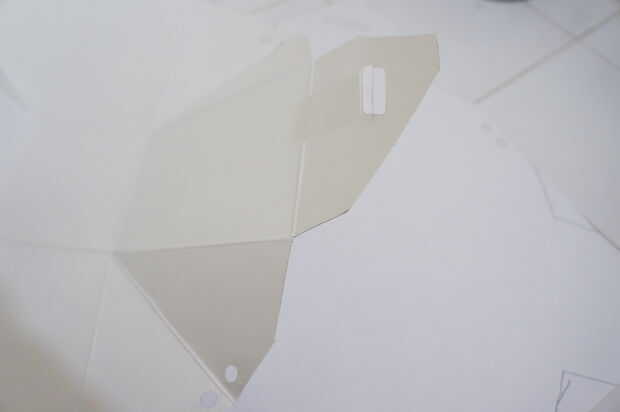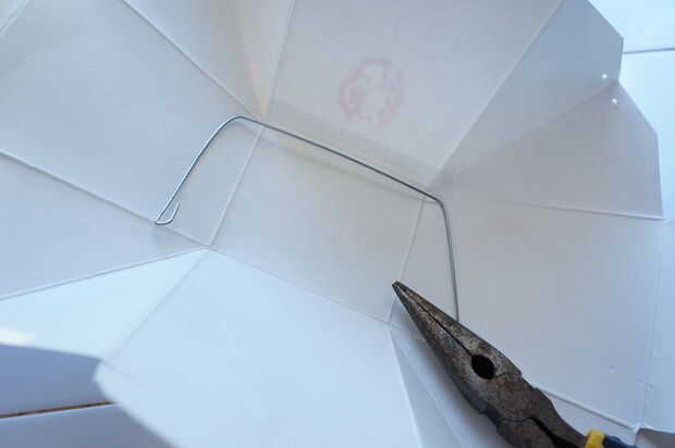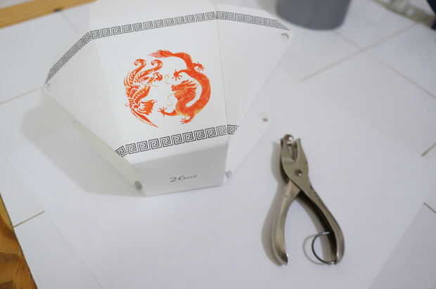 Doble los extremos juntos y alinee los orificios pequeños. Utilice el cortador de agujeros para perforar agujeros más grandes a través de ambas capas de la caja, a ambos lados de la caja como se muestra.