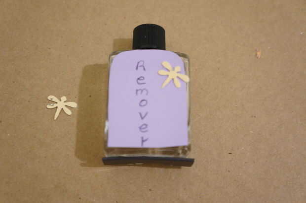 Hice una etiqueta para el removedor del pulimento de un chip de pintura y había pegado a la botella. Mi impresora no funciona pero hubiera sido genial hacer una etiqueta de lujo. Me cortar una mosca dragón de un cortador y pegados a la etiqueta.