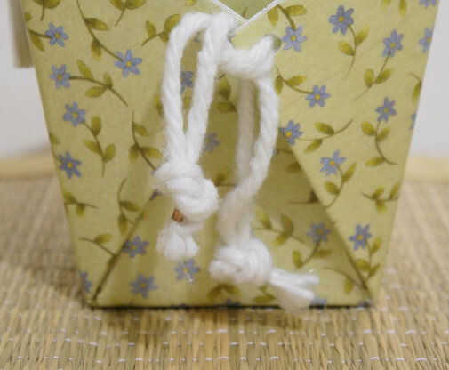 Meter la cuerda por los agujeros de la caja como se muestra y atar los extremos de la cuerda para hacer un solo nudo suelto. No estoy seguro qué tipo de nudo es, pero usted puede decidir desatar en algún momento por lo que tendría suelto.