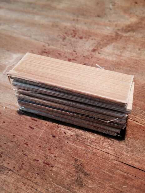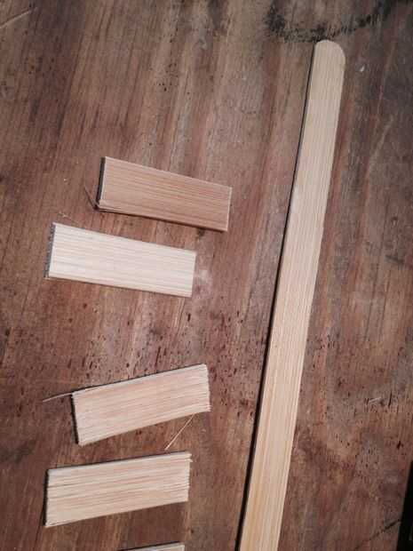 Unir piezas delgadas de bambú con las fibras a lo largo de la longitud de la pieza. Pulir la forma en la lijadora de tambor para obtener un lado redondeado (ver foto). Esta pieza se compone de una mitad de la sección delantera de la manija.