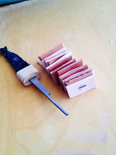 Apilar el cuero en el eje de la adición de cola para madera entre cada pieza.