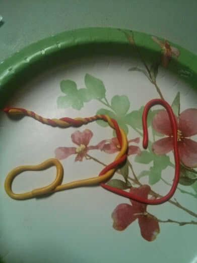 Después de rodar ambos colores en hilos largos I trenzados entre sí las partes de abajo y dejó las copas sin torcido. Luego he pulsado sobre la manija del grifo de una manera para representar el fuego.