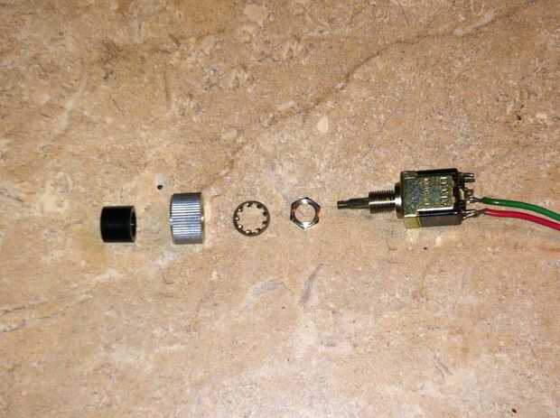 -Coloque la tuerca de final en el interruptor de agradable y apretado para sujetar el interruptor en posición sobre la pieza de plástico, y luego vuelva a enroscar el botón negro del interruptor así.