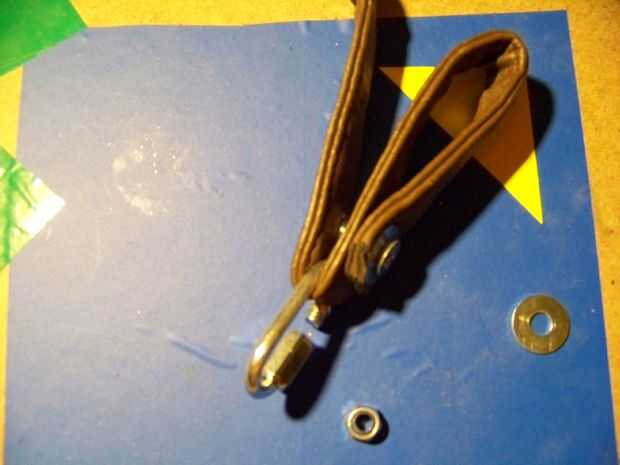Mientras clava Asegúrese que las correas están bien presed juntos, por eso coloqué la tuerca hexagonal grande debajo de una lavadora y poner presion sobre el remache desde arriba.