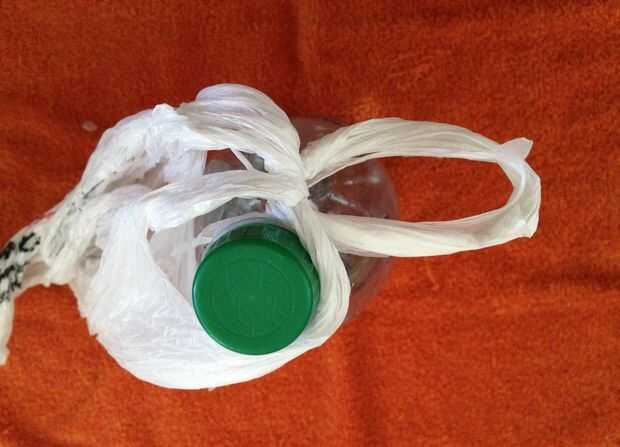 Poner un lazo de las manijas en la parte superior de la botella y luego tienes otro bucle y el espacio creado cuando usted atado el nudo del lazo este espacio en la parte superior de la botella también. Dejando sólo el segundo anillo de mango gratis.