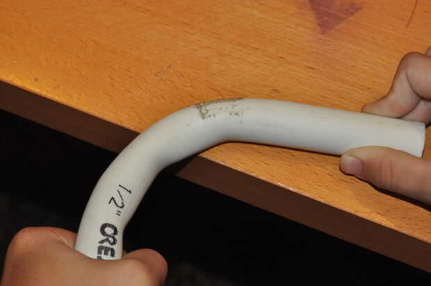 Entonces usted tiene que hacer el calentamiento y doblar el manillar al igual que usted hizo a la primera. Los siguientes no son perfectos pero si parecen un poco esto. (Si el PVC comienza a doblar puede presionarlo contra una mesa o algo para que sea más plana.