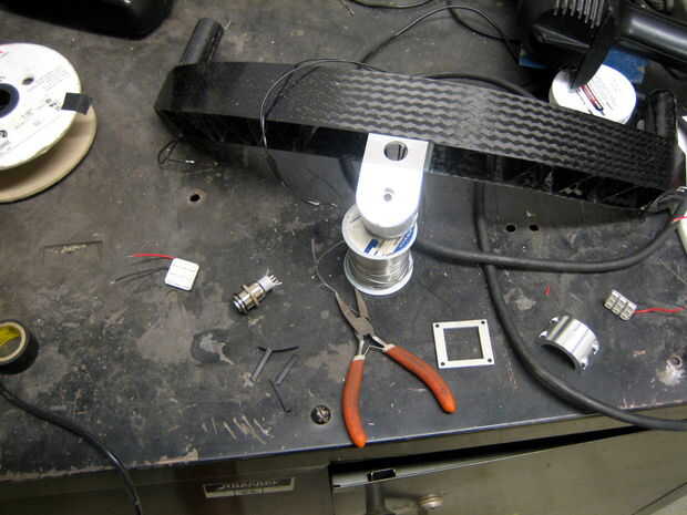 Asamblea puede tener lugar una vez que se mecaniza el tallo y todas las piezas de fibra de carbono son laminadas. La madre debe limpiar con acetona y aplicarles. Las caras para el manillar que se deban recortar de los bordes con una escalera corta y desengrasar. Las manijas deben recortarse en ambos extremos. Una sierra de mano funciona muy bien. Un archivo y papel de lija se pueden utilizar para limpiar los cortes. Toda la estructura se enlaza en un solo paso en el mismo molde como las caras se laminado en. Esta presión de manera puede ser aplicada en el paquete mientras el adhesivo se seque. Se recomienda un pegamento de epoxy de dos componentes no-sag que cura a temperatura ambiente. Capa transparente no es necesario si la calidad superficial es buena desde el molde. Hemos encontrado PVA a dar mejores resultados en comparación con otros agentes de liberación de molde.