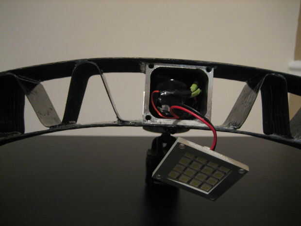 Los LEDs pueden ser conectados y cableados una vez terminada la vinculación. Utilizamos LEDs de 12V para uso del automóvil con cuatro pilas CR2032. Obviamente todos los LEDs fueron conectados en paralelo con el pulsador actuando como interruptor. Se espera que la duración de la batería a ser más de una hora con las baterías actuales. Con menos LEDs y baterías más grandes la vida sube.