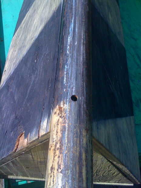 Con una broca de 3/16, haga 3 agujeros el afrontamiento, a través de todo el camino. La primera debe ser de 3" en desde el final del interior del triángulo, debe ser el siguiente en medio de la tubería y la última 3" desde el interior extremo del otro triángulo. Ahora y en la parte superior de la cofia, con una broca de 7/16, abrir los orificios en la parte superior solamente. Ahora debe tener un orificio de 7/16 en la parte superior y un orificio de 3/16 en la parte inferior. Esto debería permitirle poner un tornillo de 3" a través del agujero superior y solo poniendo el cuerpo del tornillo a través del segundo agujero.