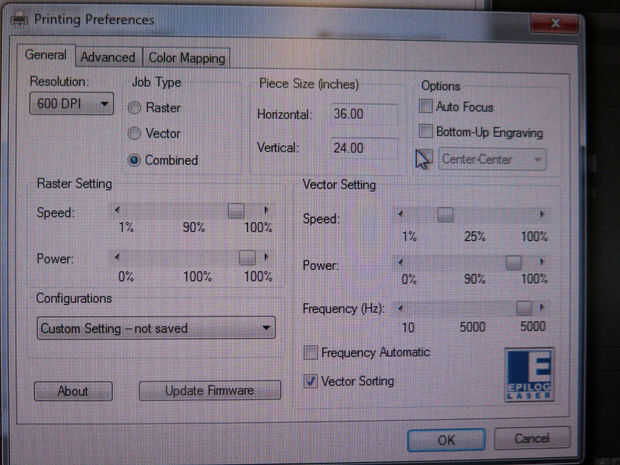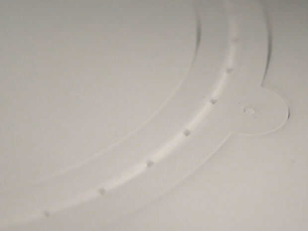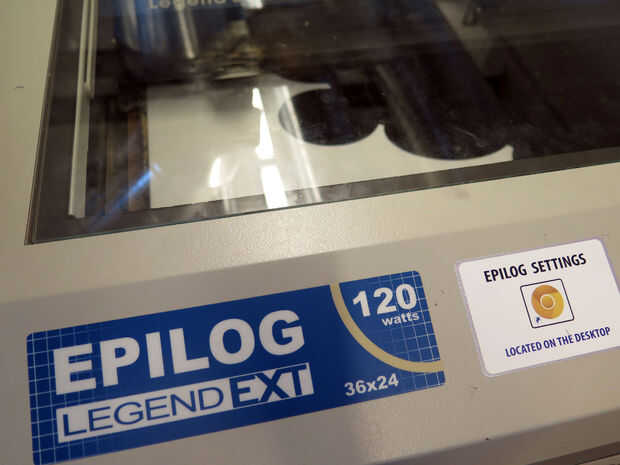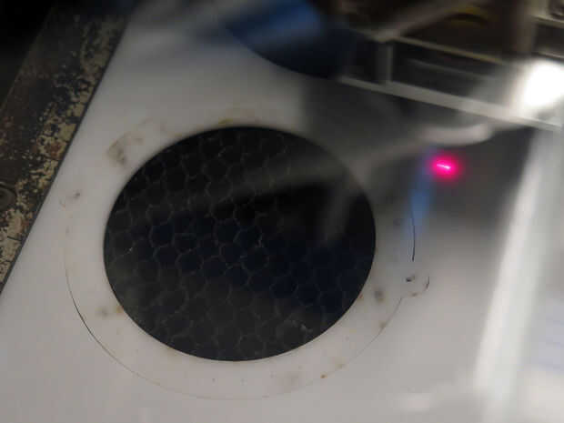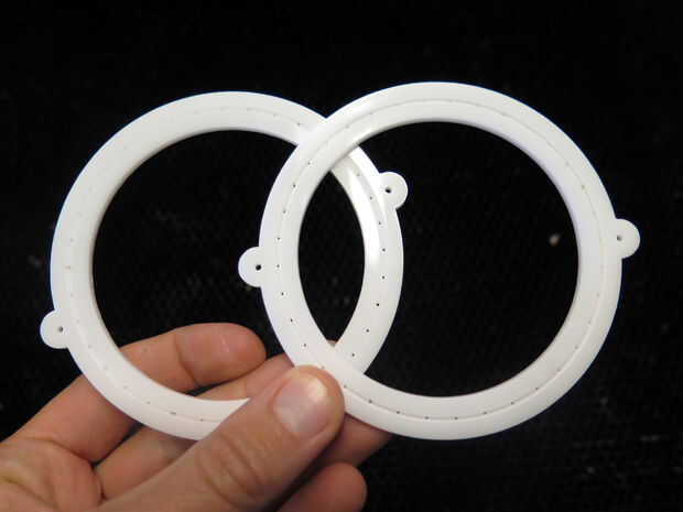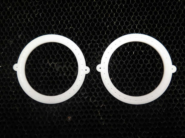 Corté mis dos marcos circulares en un lasercutter Eplilog 120 vatios. Se cortan todas las líneas, excepto la línea más gruesa que es grabada. Esto es para que cuando la tela se cose a la estructura de las puntadas de hilo pueden receso en el marco de modo que nada está en el camino los dos bastidores moviendo y girando uno contra el otro.