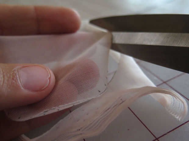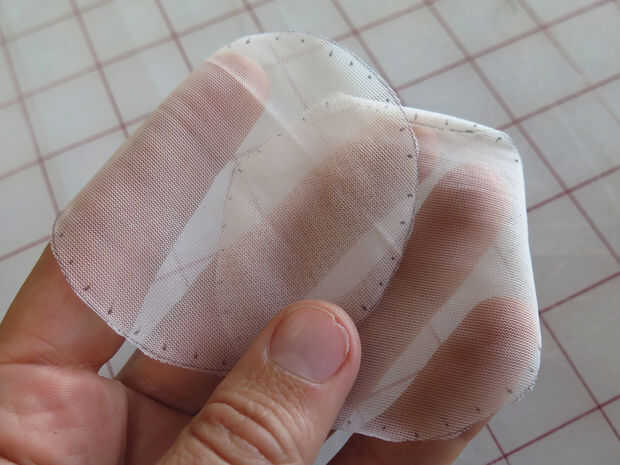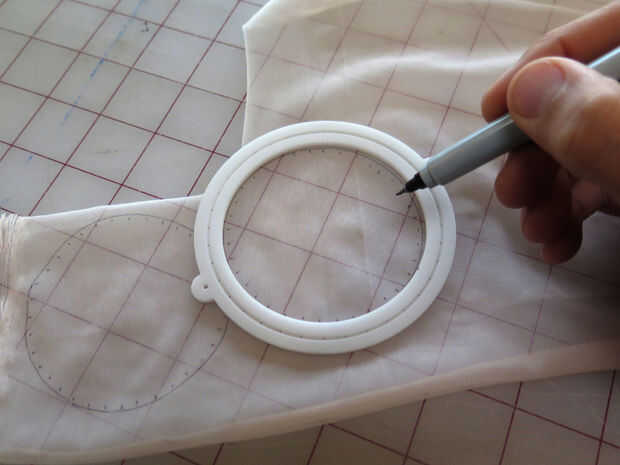 Use el cuadro para marcar los agujeros en la tela. No marque los agujeros exactamente donde están, pero hacia el interior en lugar de 1 cm. Esto hará que la tela de estiramiento como usted cose al marco. Cortar dos círculos de tela como se muestra en las fotos.