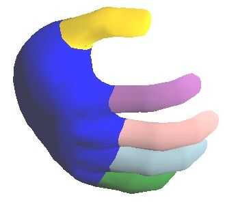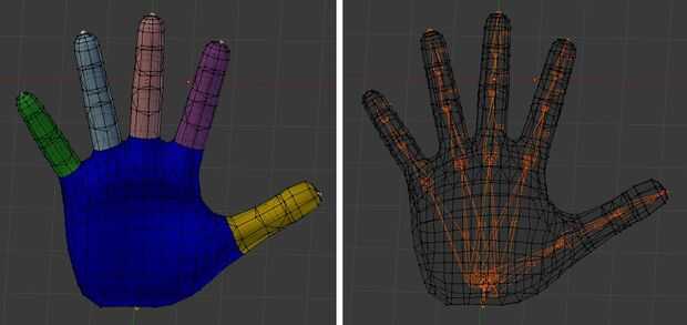 Aquí, la mano no es rígida, así que construí un modelo deformable (ver imagen). Este modelo se llama una malla de piel.