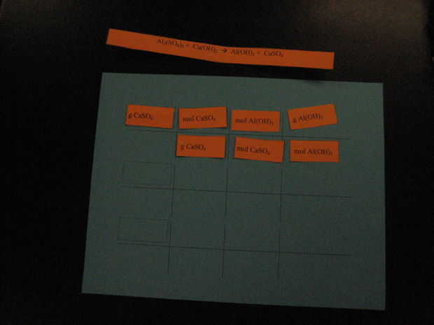 Cada conjunto contiene varias combinaciones de unidades y compuesto del producto químico y una tira con una reacción química. Doy a los alumnos una serie de problemas diferentes y se mueven las cartas a los puntos para hacer la conversión entre gramos, moles y moléculas.
