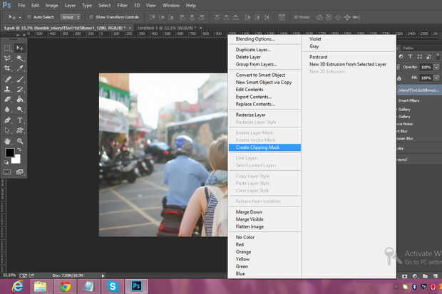 Ahora hacer su capa principal visible, después de esto clic derecho sobre la capa y seleccione "Crear máscara de recorte"