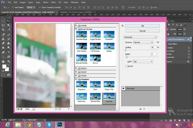 Ir a filtro Galería-textura-texturizar y set siguiente valores: textura: lona; escala: 50%; relieve: 2.