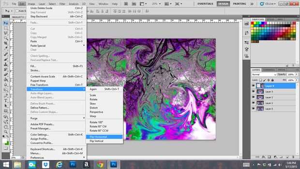 Con la herramienta mover, presionada la tecla Mayús y haga clic en y arrastre la selección hacia la derecha, deteniéndose en el borde. También puede utilizar las teclas de flecha para mover. Haga clic en Edit -> Transform -> Flip Horizontal. Haga clic derecho sobre la capa superior (lado izquierdo de la imagen) y haga clic en Combinar hacia abajo.