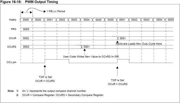 Ejemplo: Si la palanca tiene un valor de 5 y OCxRS se carga con un valor de 2, OCxR se carga con el 2 como bien. TMRy empieza a contar en 0. En 1, salidas de un alto valor y permanece allí. En el tiempo 2, nada cambia, OCx ha sido alto para la 1 cuenta. Al tiempo 3, OCx gotas baja puesto que ha sido elevado para 2 cuentas. Al tiempo 3, 4 y 5 nada cambia pero TMRy = palanca, por lo que se restablece y entonces empieza nuevamente en 0 en la siguiente cuenta. 1 señal de reloj pasa, que es Conde 0 otra vez y en la cuenta 1, OCx salidas alta otra vez. Aquí es figura 16-18 de sección 16: salida de comparar del manual de referencia familia PIC32: