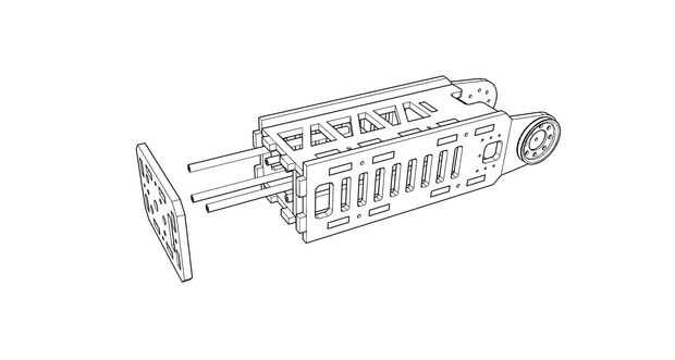Deslice el láser de corte de placa a través de las varillas de aluminio de la Asamblea de extrusión y en el montaje principal del antebrazo. Tornillo de la placa en su lugar con 3 tornillos en las barras de aluminio roscado, uno para cada barra y con 4 tornillos sobre el láser de corte superior, inferior y laterales.