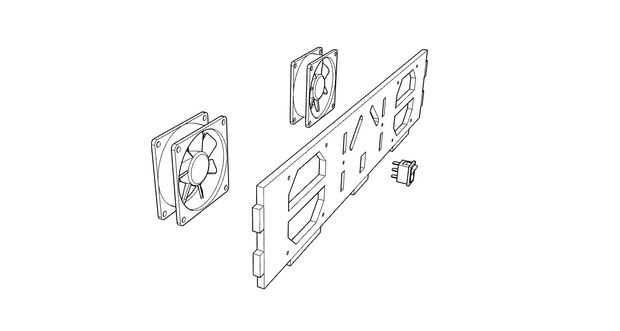 Ahora, preparar la placa trasera del tórax. En la placa trasera del pecho, hay un interruptor de eje de balancín para el giro que del robot mitad superior encendido y apagado, así como dos ventiladores de PC de 80 mm para la refrigeración de la electrónica. El interruptor se conecta al perfboard desde rutas y paso pecho--0 12 voltios de potencia de la regleta ubicada en la base del robot. Coloque el interruptor en la placa de tórax posterior y fije ambos ventiladores de ordenador en la placa del pecho espalda con 4 tornillos y 4 tuercas hexagonales como se muestra en la imagen de arriba.