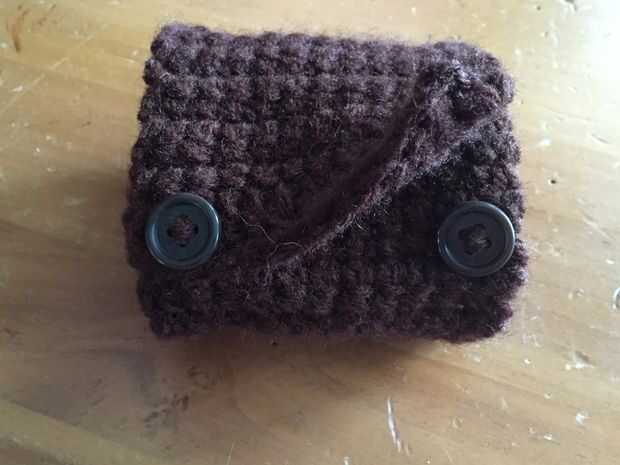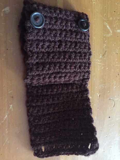 Trate y ver si cabe. Quitar y doblar en la fila 29, donde usted solo ganchillo en el lazo delantero. Coser las piezas con los lazos de apoyo como guía (me olvidé de tomar fotos de este paso). Ahora doble la aleta hacia abajo y marque donde van los botones. Luego coser los botones. A continuación, realizar los orificios de botón al poner los botones en uno de los agujeros en el crochet doble. Consejo: vuelva el manipulante del vórtice tiempo y atar el hilo. Esto oculta todos los nudos y que se vea mejor.