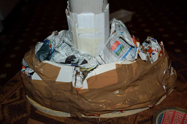 forma la cabeza del ingenio más bolas de periódico y cinta.