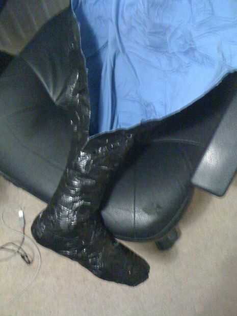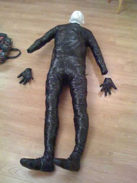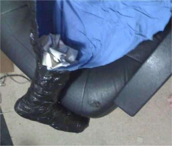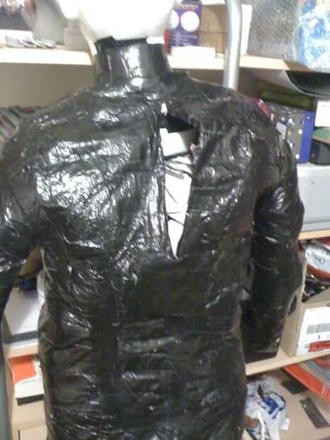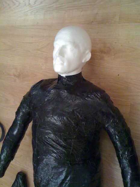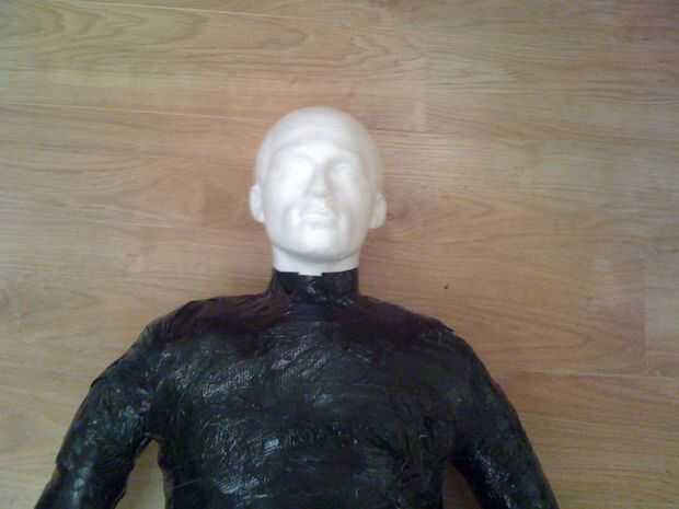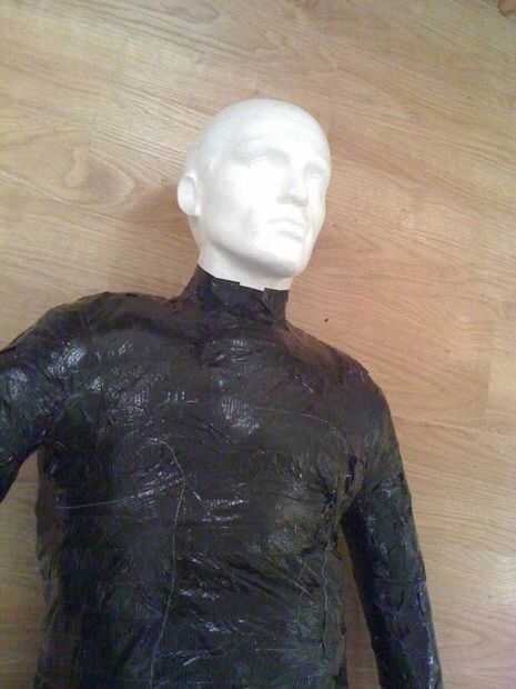 Comienzan en los pies, mantenga los 2 lados donde cortar juntos y poner cinta aislante a través de él para sujetar juntos, trabajar su camino hasta el corte en el mismo señorío superposición de la cinta del conducto como vas. trabajar hasta el tobillo y luego parar.