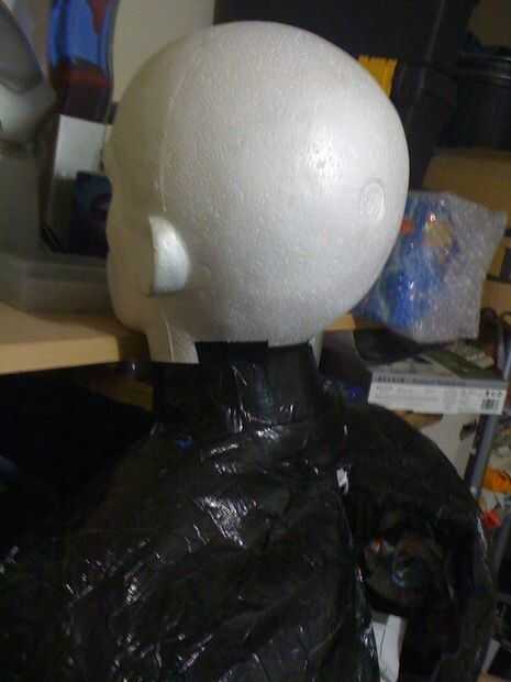 Si tienes una cabeza para tu maniquí pone esto en el agujero del cuello y cinta del cuello a la cabeza y un poco hacia abajo la parte posterior del cuello dejando una apertura a cosas el espacio restante, cosas del resto del espacio entre los hombros y luego cinta que último agujero para arriba y listo.