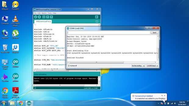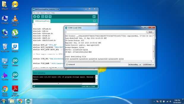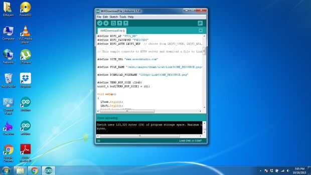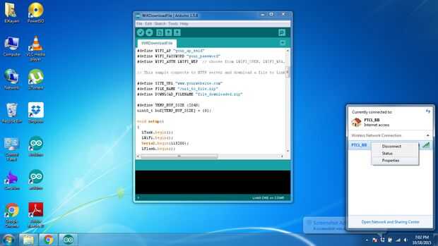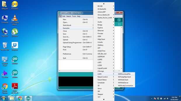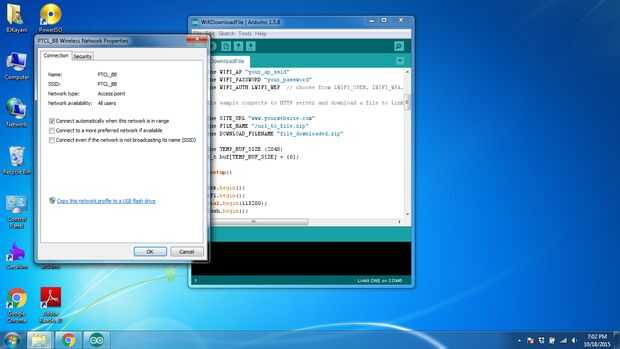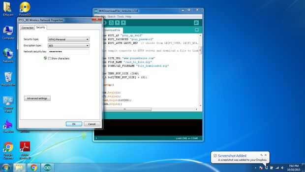 Para esto abrir el Wifi descargar ejemplo en el IDE. Introduzca su nombre de red y contraseña. También el tipo de seguridad. Usted puede encontrar esto abriendo la configuración de red. Luego ingresar el link de descarga como se muestra a continuación