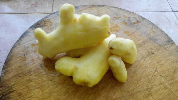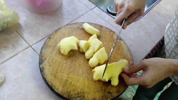 2. Cortar el jengibre en piezas grandes de aproximadamente 1" por 2".