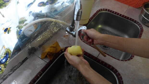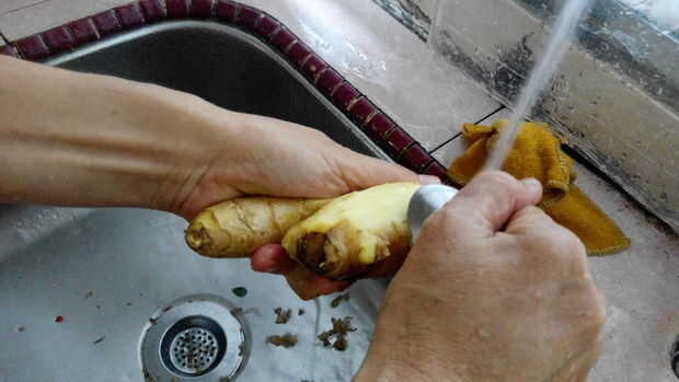 1. Use una cuchara para el desguace de la piel del jengibre bajo agua corriente.