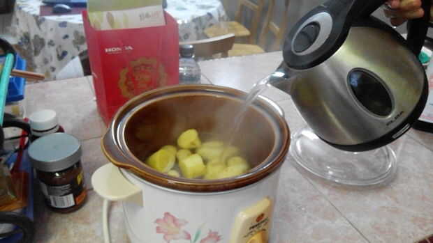 4. Vierta el agua de hervir en olla hasta ¾ completo.