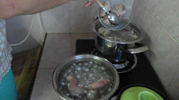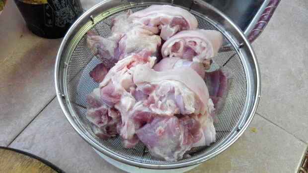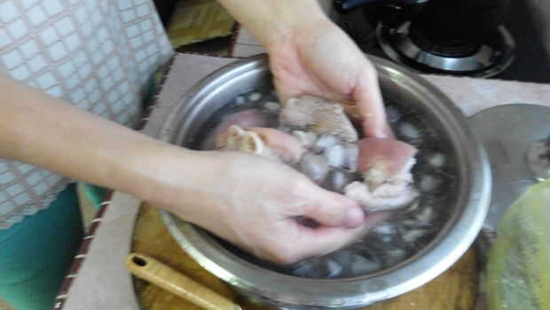 5. Escurrir las manitas de cerdo y transferir al agua hirviendo.