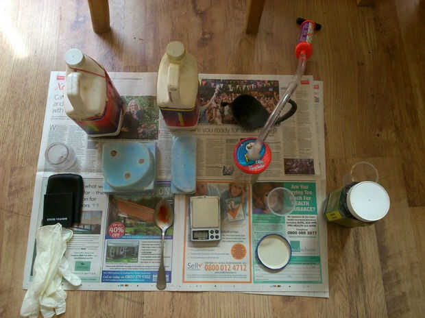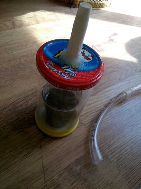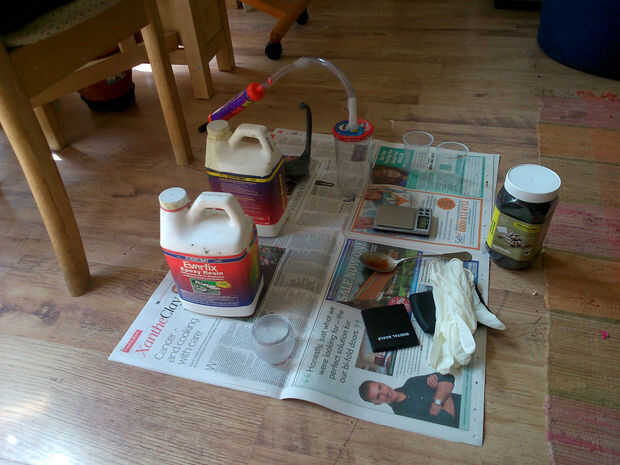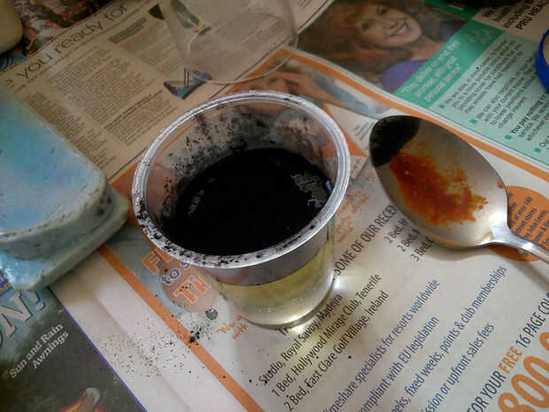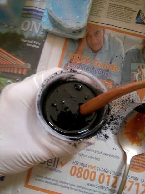 Después igual peso; piezas de la resina en el mismo recipiente, he añadido un polvo de tóner negro en la resina para dar a la pieza moldeada por un color base negro. Bien mezclados todos los ingredientes de buena 3-4 minutos que naturalmente causa un montón de burbujas que aparecen. Tiempo para colocar la resina dentro de la cámara de vacío y conectar la bomba de succión.