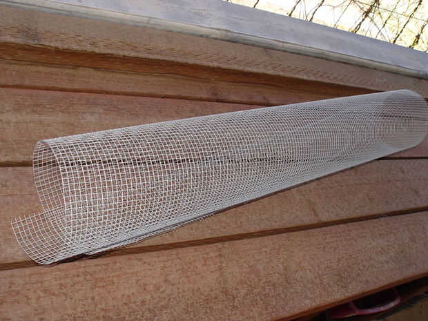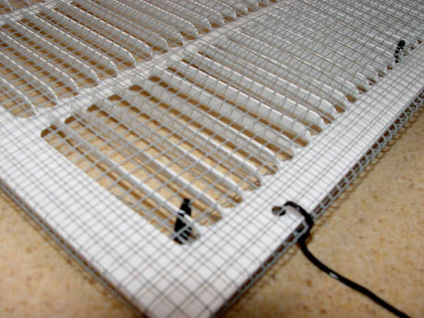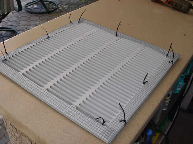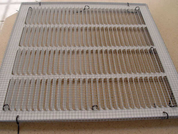 Usé la segunda ventilación que debía romper los terrones más. Envuelve 1/4" tela metálica sobre la parte superior de la rejilla de ventilación. La tela metálica (Foto 1) está disponible en Home Depot y se usan menos de la mitad del rollo para hacer el discriminador. Coloque la rejilla sobre la tela metálica y marque para cortar dejando 1 1/2 de tela extra a lo largo de cada borde. Corte la tela con tijeras, cortador de alambre y amoladora. La tela metálica es entonces cortada en cada esquina y envuelto firmemente alrededor de los bordes de la rejilla. Se llevó a cabo en lugar con 4" bridas (fotos 2,3,4). Una vez que todo es seguro, los lazos de clip de los extremos del cable.