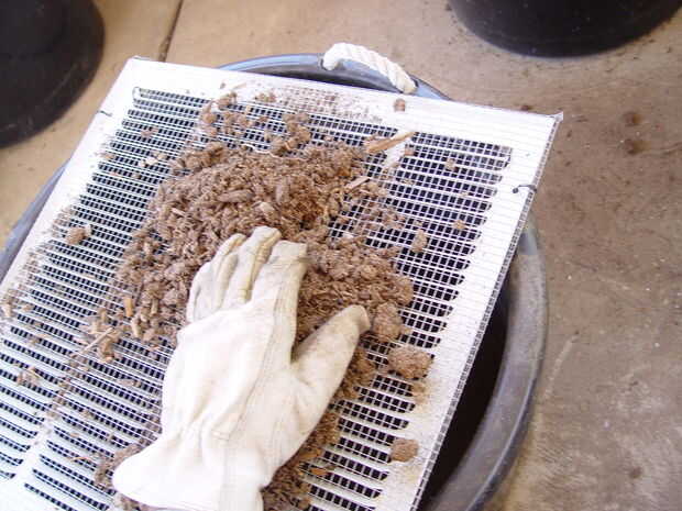 Para tamizar la turba, descarga un montón de su turba rallado sobre la pantalla. Usando guantes, simplemente empuje la turba en un movimiento circular contra la pantalla con la mano (Foto 5). La pantalla corta la turba a una consistencia muy fina con poca necesidad de una fuerza excesiva. La rejilla actúa como un firme apoyo contra la presión de su mano.