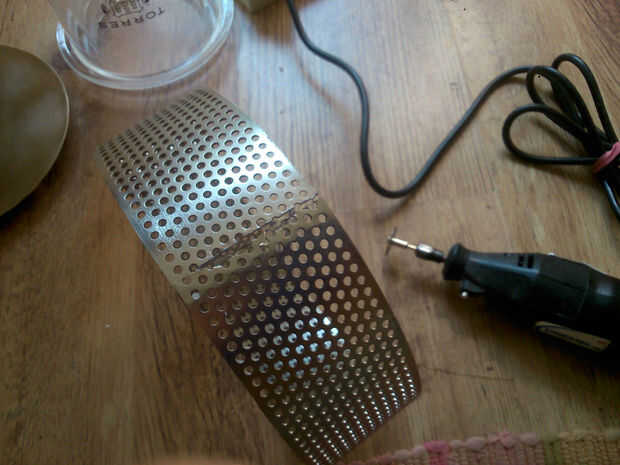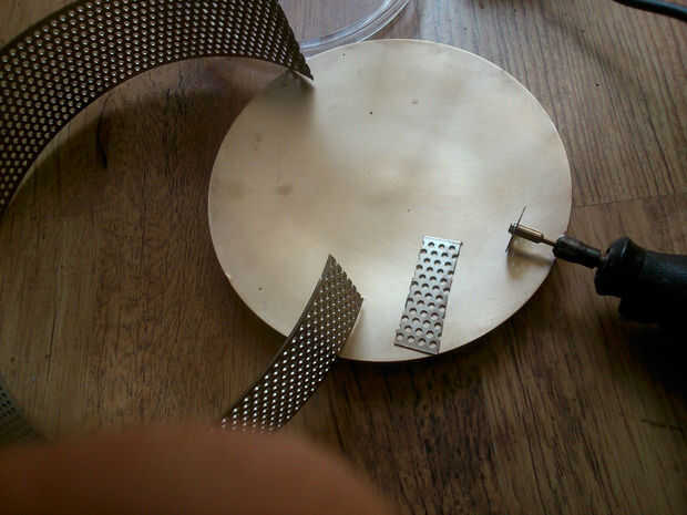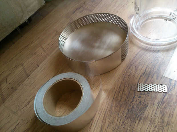 Resulta que tenía este circular metal malla anillo que mi lugar de trabajo arrojó lejos cuando han actualizado las luminarias. Porque fue cm pocos demasiado grande, corte el exceso con una dremel y Unidas con una cinta aislante de aluminio.