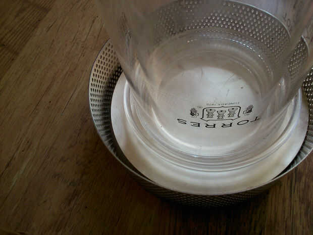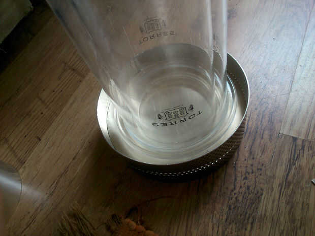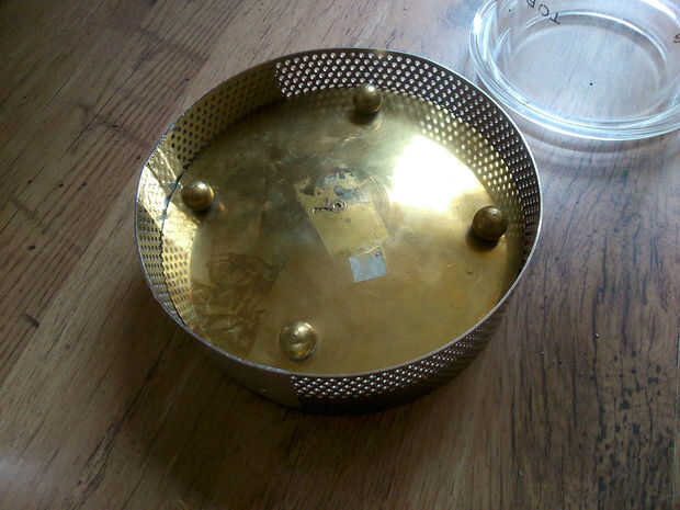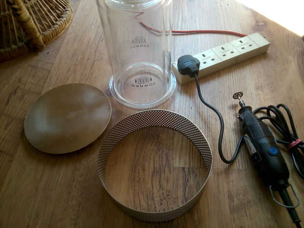 Porque esto era un recipiente mucho más grande, tenía un poco difícil encontrar una base para ello. Al final logró encontrar esta placa de cobre escondida en mi caseta recibí por centavos de un carboot de años anteriores. Su diámetro era mayor que del cubo del apertura que fue exactamente lo que iba después. Así que ahora tenía que crear algún tipo de la apretado barrera de aire entre él y el cubo de hielo. Para ello pensé usando goma de silicona que ya tenía y la siguiente tarea era crear una pared circular para verter el caucho de silicona en.
