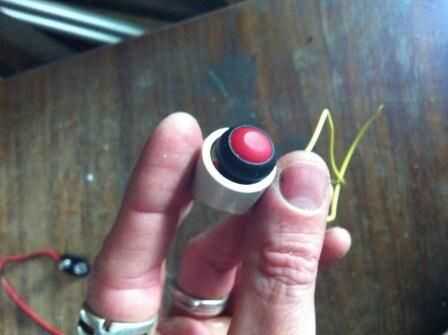 2. la primera cosa a hacer es añadir el interruptor momentáneo a la manija. Para ello pegado el interruptor en un arbusto de 15mm y cableado algunos cables en cada uno de los terminales. Luego hice un par de ranuras en el extremo del casquillo para poder poner una ite de cable a través de ellos y adjuntarlo a la manija.