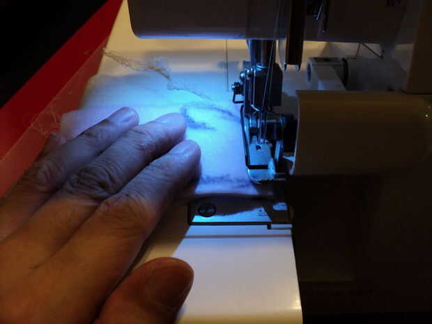 Conecte el otro extremo de la tira de la mano a la pieza posterior de la tela con la costura en el exterior.