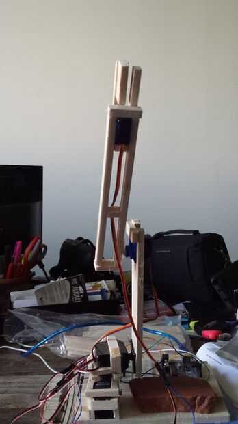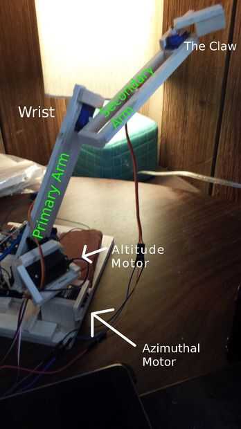 Lamentablemente no tengo sólidas instrucciones sobre cómo montar el brazo porque fue un proceso de ensayo y error para mí y creo que será un buen rompecabezas chicos demasiado :) Haré mi mejor para explicar el diseño y cuadros de cada brazo, pero depende de ustedes chicos a hacer la Asamblea. Usé sólo Balsa madera, pegamento caliente y clips de papel para montar mi brazo. Sin duda no estás restringidos a crearlo como tengo, no dude en utilizar su propio juicio en este caso. Algunos de los servos se atornillan a la madera de balsa para apoyo adicional, usar tornillos que están unos tan grandes como los que desea utilizar para atornillar un brazo en uno de sus motores servo.