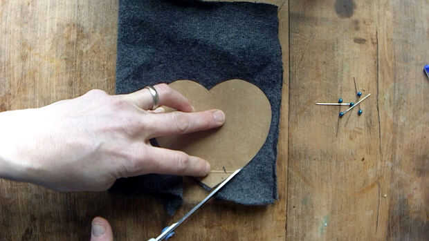 Coloque su viejo suéter y forma deseada. Atención: no utilice ningún tipo de suéter de acrílico. Sólo podría derretir en el microondas. Cortar dos formas y coserlas juntas dejando un espacio para rellenar con arroz.