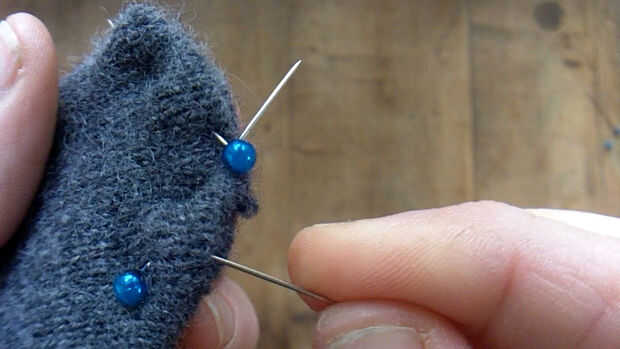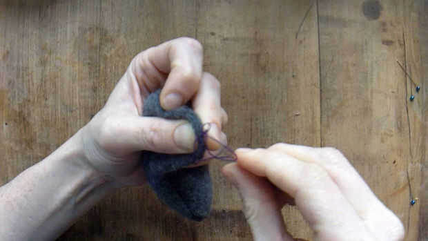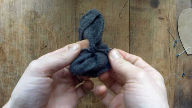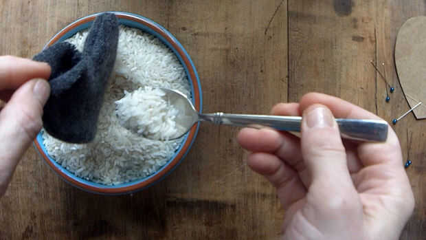 Girar las formas cosidos derecho relleno con arroz. No sobrellene. Se necesita espacio para más adelante. En este punto realmente podría poner unas gotas de aceites esenciales en el arroz para darle un olor agradable. Pin el agujero junto y a mano cosen cerrado.