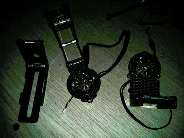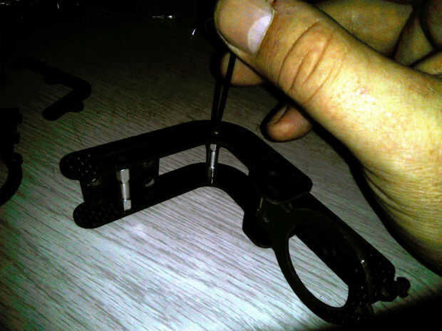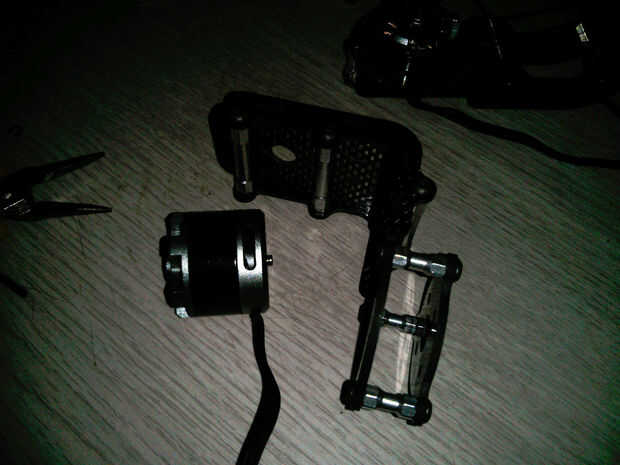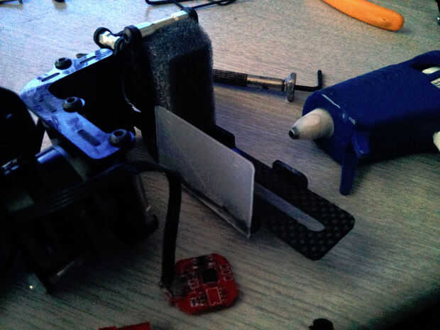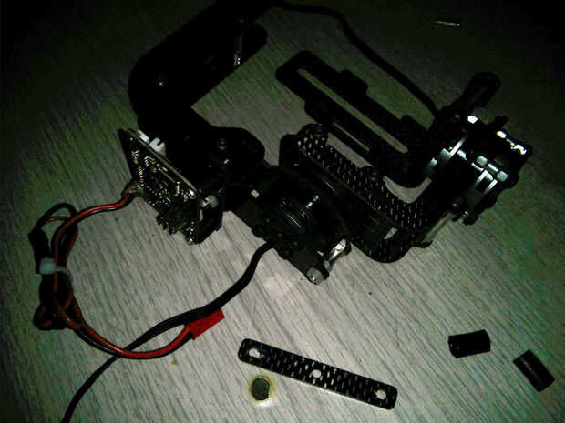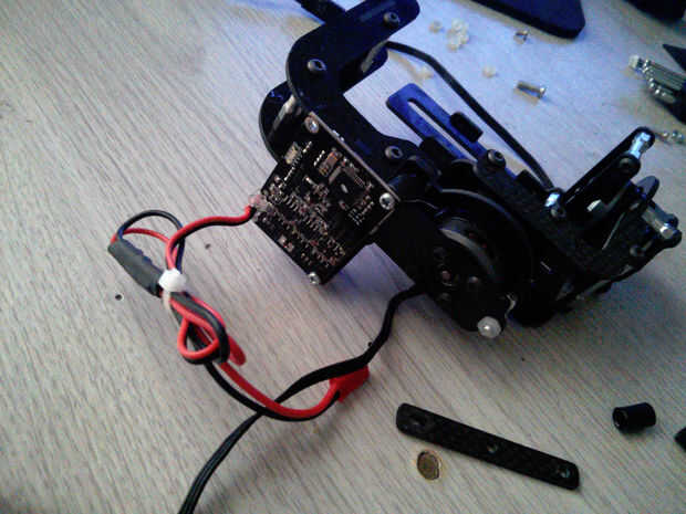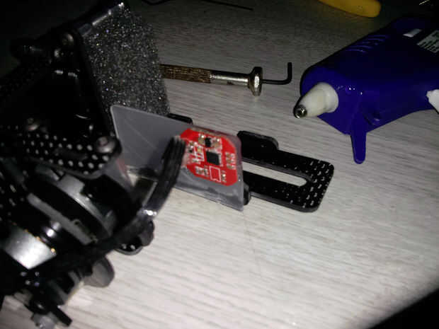 Cardanes más raramente vienen completamente ensambladas, sobre todo si usted fuente sus piezas por separado. Como se mencionó, mina fue creado usando un marco de fibra de carbono, motores y junta que obtiene por separado de Amazon, que había sufrido alguna alteración. Para este proyecto, que no necesitan las placas de montaje o amortiguadores de vibraciones que pueden requerir volver a montar la placa de control en otro lugar. Mina reubicado en la parte posterior del brazo cardán, asegurando que el sensor tenía suficiente longitud para llegar a la montura de la cámara. Con el retiro de la guiñada, tuve que encontrar un nuevo lugar para montar el sensor, que por caliente pegando una tira de plástico al lado de la estructura de la cámara.
