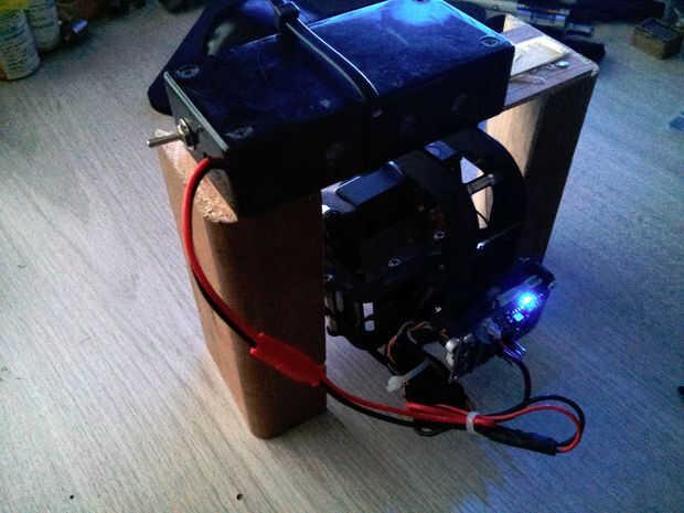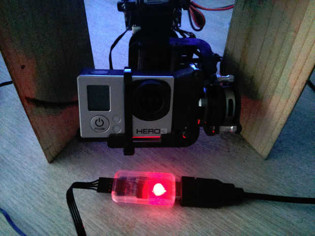 En primer lugar, recomiendo instalar su Gopro como su cardán requerirá su peso para funcionar correctamente. Sería una buena idea de involucrar a la conexión wifi por lo que puede ver salida de vídeo como está modificando parámetros de cardán. Por lo que pude establecer mi montaje del cardán y ver su funcionamiento, he creado un pequeño marco que constaba de dos pilares de 5" con un travesaño, que se se suspendería, permitiendo que las manos libre operación. A continuación adjunto el paquete de baterías y hace la conexión eléctrica.