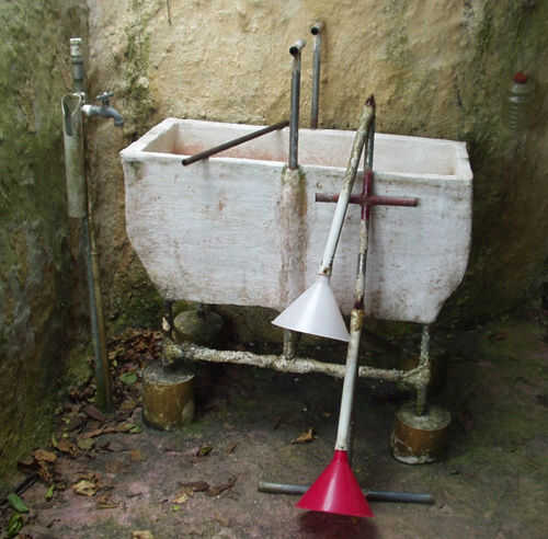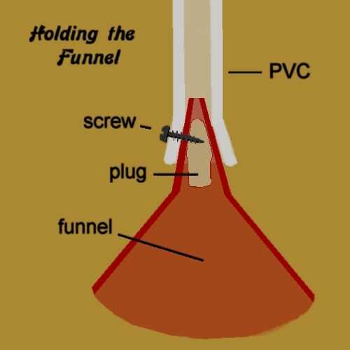 Las tuberías verticales los embudos y el mango de conexión están hechas de tubo de PVC. Que son formado en un extremo para ajustarse en el embudo al calor. Un enchufe dentro, hecha de madera o PVC Termoformado está asegurada por un tornillo de metal de hoja y mantiene el embudo en su sitio.