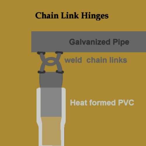 El tubo de PVC vertical está termoconformada en el otro extremo para cumplir con parte de una bisagra de eslabones de la cadena. Eslabones de la cadena se sueldan con autógena para el mango y un trozo de tubería que entra en los tubos verticales de PVC. Ver los diagramas.