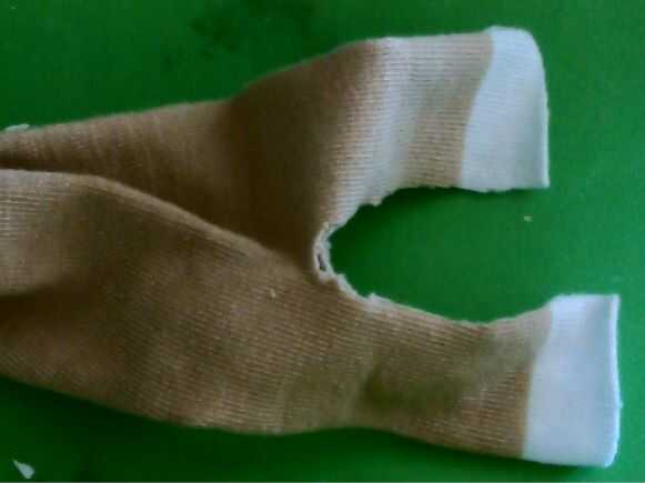 Luego cortar una tira de material desde la parte superior del calcetín para hacer las piernas.