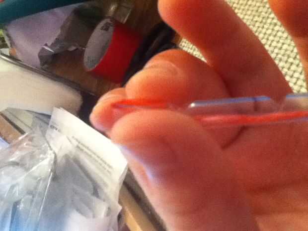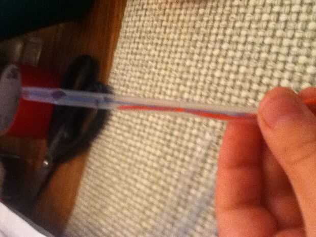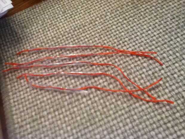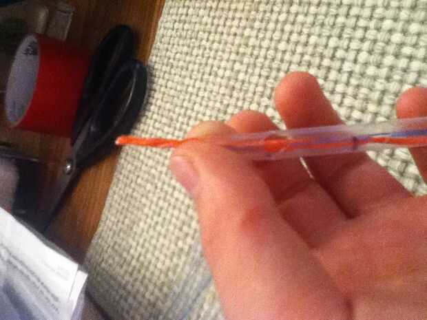 Now for the strings. Tomar su cadena, alimentación a través de un dedo paja (a partir de la parte inferior) y doble sobre la paja en la parte superior, casi en la V primera. Luego córtala 4 pulgadas o menos en la parte inferior. Hacer esto para todos los dedos. Asegúrese de no estropear que cuerda va con cada dedo! Si no entiendes lo que quiero decir, mira las fotos. Es aceptable si se despliega el doblez.